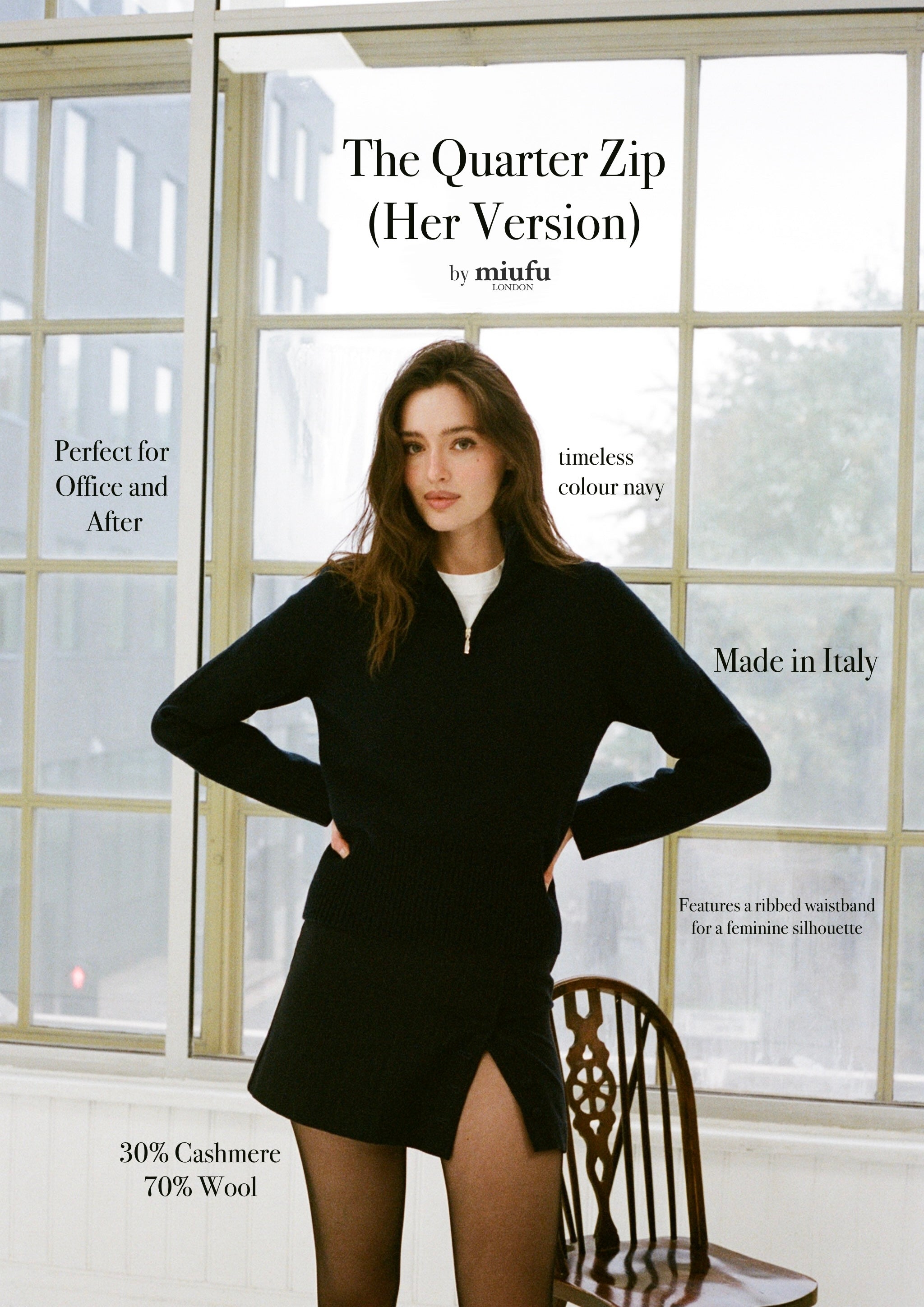The Quarter Zip is a piece I often saw worn by colleagues, friends, and men walking the corporate streets of London. But I always asked myself, why wasn’t the Quarter Zip ever truly designed with women in mind? Why was the first image that came to mind always a man wearing it? And why, when searching for “Quarter Zip for women” online, were the options limited to loungewear or cropped jumpers? It felt like time for a change, so we created "The Quarter Zip (Her Version)"